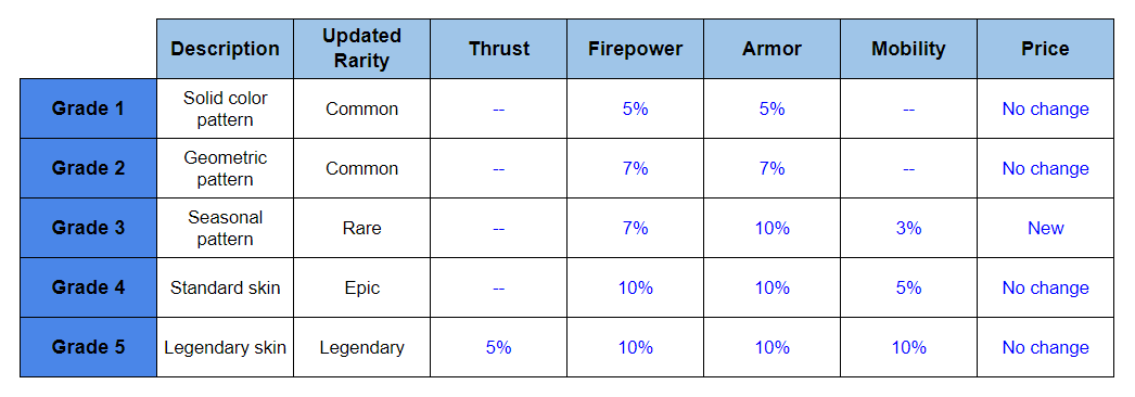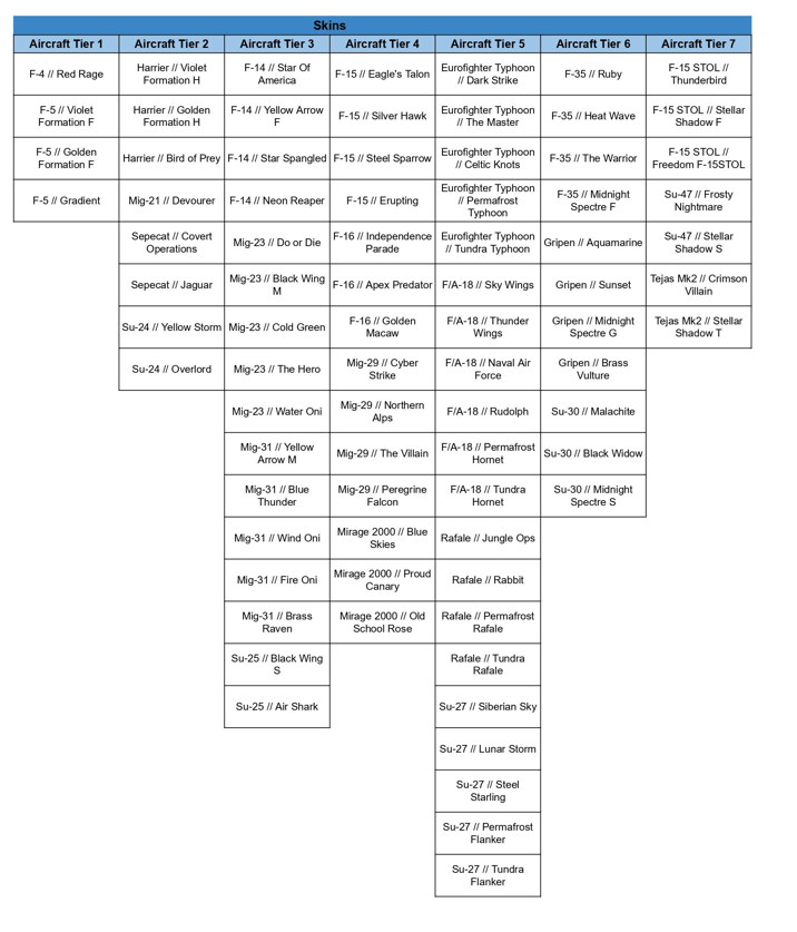 - The standard skins are always available for your aircraft (each aircraft has one), and were upgraded to Grade 4. Prices stayed the same, while it gives an extra +5% mobility!