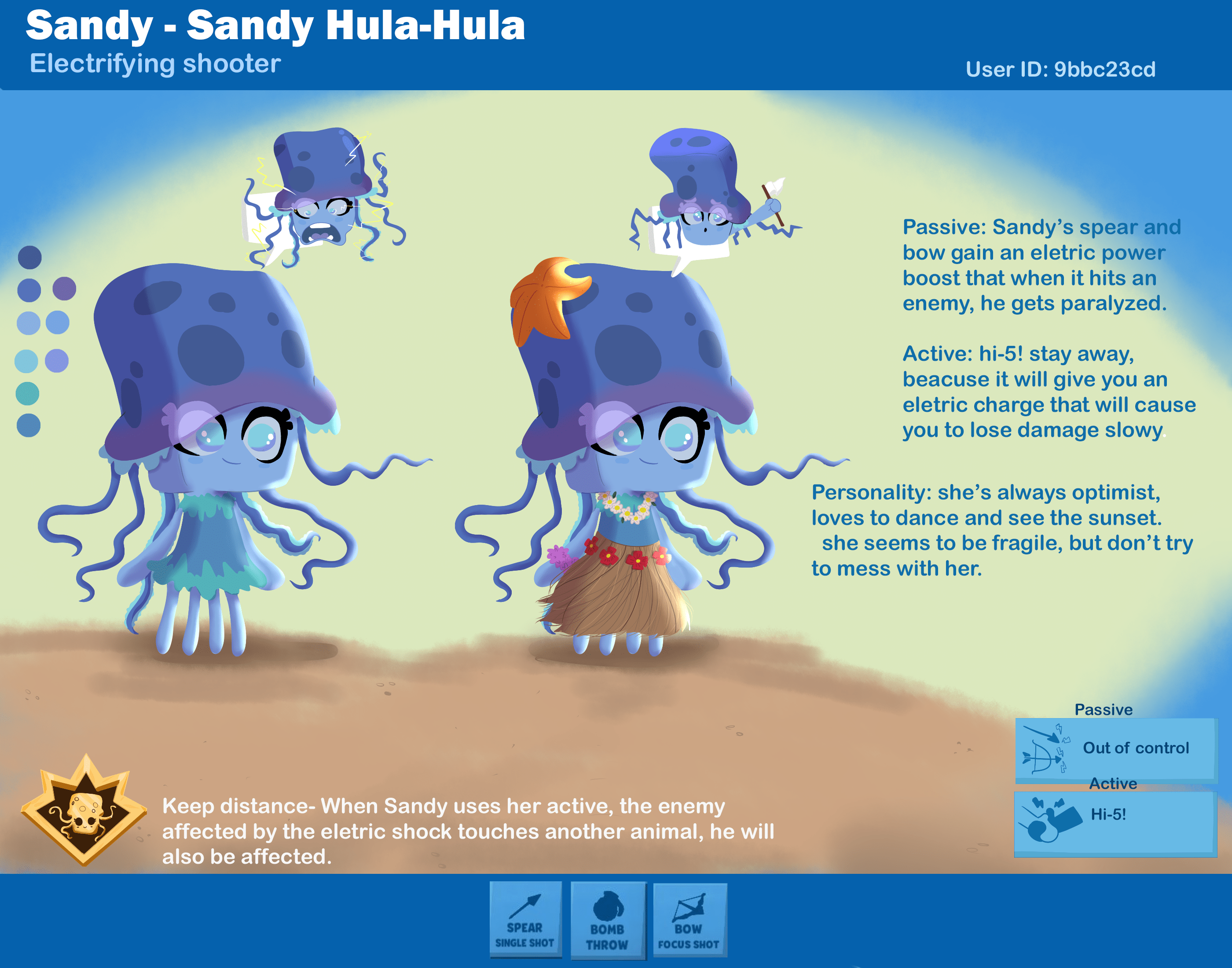 Description: Meet Sandy Hula-Hula! Passive: Sandy’s spear and bow gain an electric power boost that when it hits an enemy, he gets paralysed. Active: hi-5! Stay away, because it will give you an electric charge that will cause you to lose damage slowly. Personality: She’s always optimistic, loves to dance and see the sunset. She seems fragile, but don’t try to mess with her! Primal: Keep distnace- When Sandy uses her active, the enemy affected by the electric shock touches another animal, he will also be affected.