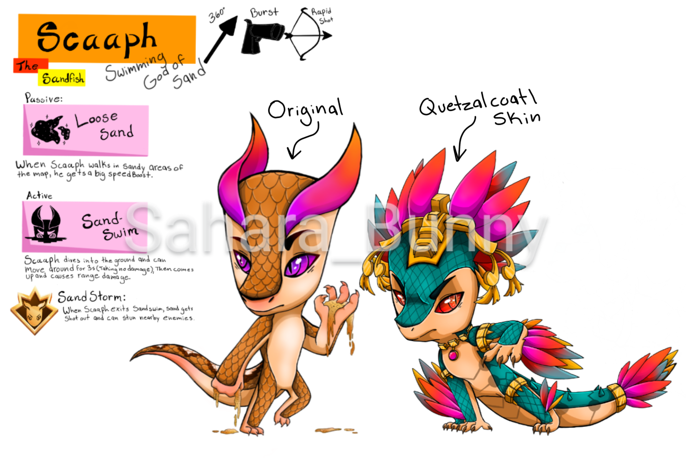 Description: Introducing Scaaph the Sandfish! This reptile can swim through sand as if it was water! He is a medium to short range speedy killer! Passive: When he walks in sandy areas of map be gets a speed boost. Active: Dives into ground and can move around for 3 sec (taking no damage), then comes up and causes range damage. Primal: When he exits his active, sand gets shot out and can stun nearby enemies. His skin would include QuetzalCoatl Scaaph! Based off the feathery Mayan god. Scaaph has strange horns that take on a unique coloration due to him being around radioactive material when he was young! When he was sent to the zoo he began to grow in power and start training to not only swim through sand but the dirt and ice around the zoo!