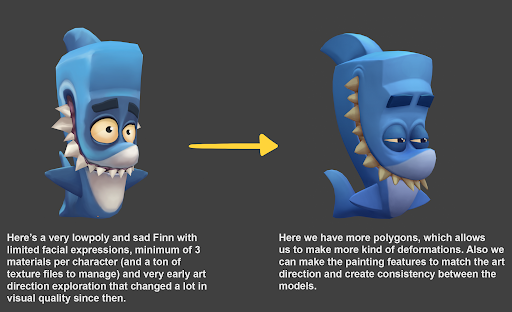 Aesthetically we have a huge difference between the first characters and the newer ones, much better polished (for reference please see given example below*). Going from a texture swap system to a facial rigging one made the characters ready for a wide range of expressions, bringing them to a much higher level of artistic quality. Although the players might not notice it too much or compare the characters, the difference is there.
